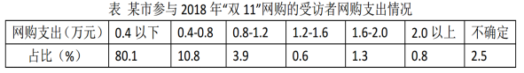 D.“雙11”網(wǎng)購(gòu)支出0.8—1.2萬(wàn)元的受訪者人數(shù)比網(wǎng)購(gòu)支出1.6—2.0萬(wàn)元的多2倍