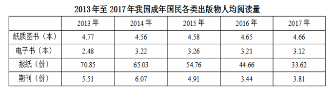D、2017年我國成年國民人均每天閱讀紙質(zhì)圖書時(shí)長低于閱讀報(bào)紙與閱讀期刊時(shí)長之和