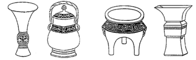 109.鬲(lì)是古代一種煮飯用的炊器,有陶制鬲和青銅鬲,其形狀一般為侈口(口沿外傾),有三個中空的足,便于炊煮加熱。觚(gū)是古代一種用于飲酒的容器,也用作禮器,圈足、敞口、長身,口部和底部都呈現(xiàn)為喇叭狀。卣(yǒu)是古代的一種酒器,口橢圓形,圈足,有蓋和提梁,腹深。尊(zūn)是古代的一種大中型盛酒器,圈足,圓腹或方腹,長頸,敞口,口徑較大。