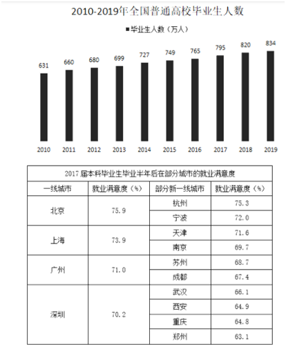 1979年全國普通高校畢業(yè)生人數(shù)為8.5萬人,1980年為14.7萬人,2001年為114萬人,2002年為145萬人,2010年較上一年同比增長(zhǎng)3.4%,2018年首次突破了800萬人,2019年預(yù)計(jì)達(dá)到834萬人,畢業(yè)生就業(yè)創(chuàng)業(yè)面臨嚴(yán)峻形勢(shì)。