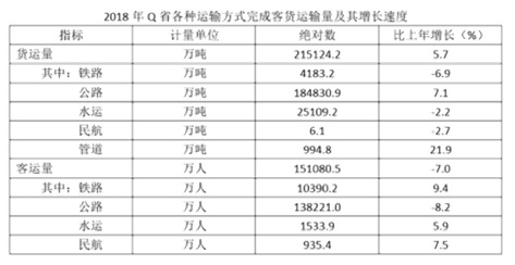 Q省2018年客貨運(yùn)輸換算周轉(zhuǎn)量5096.9億噸公里,比上年增長(zhǎng)4.5%。貨物周轉(zhuǎn)量4143.3億噸公里,增長(zhǎng)0.8%。其中,鐵路周轉(zhuǎn)量729.6億噸公里,下降10.0%;公路周轉(zhuǎn)量2731.8億噸公里,增長(zhǎng)5.9%。旅客周轉(zhuǎn)量1768.2億人公里,增長(zhǎng)12.8%。其中,鐵路周轉(zhuǎn)量865.6億人公里,增長(zhǎng)28.0%;公路周轉(zhuǎn)量767.3億人公里,下降1.2%;民航周轉(zhuǎn)量132.3億人公里,增長(zhǎng)18.0%。