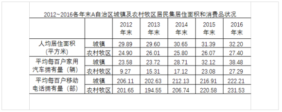 2016年末A自治區(qū)城鎮(zhèn)人均居住面積達(dá)32.20平方米,比1978年末增長了5.5倍;農(nóng)村牧區(qū)人均居住面積達(dá)27.40平方米,比1985年末增長103%。2016年末A自治區(qū)城鎮(zhèn)居民家庭每百戶擁有家用汽車38.48輛、家用電腦62臺、移動電話222.21部;農(nóng)牧民家庭每百戶擁有家用汽車27.29輛、家用電腦23臺、移動電話231.53部。