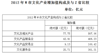 2012年,Z省W市實(shí)現(xiàn)文化及其相關(guān)產(chǎn)業(yè)增加值比上半年增長9.6%。在文化產(chǎn)品制造業(yè)中,文化印刷、文化用品制造和公益美術(shù)品制造三大主導(dǎo)行業(yè),2012年分別實(shí)現(xiàn)增加值21.82億元、11.57億元、6.62億元。