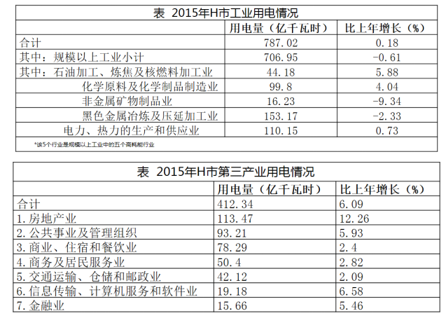 2015年,H市全社會用電量1405.55億千瓦時,比上年增長2.76%。全年各產(chǎn)業(yè)和生活用電情況分別為:第一產(chǎn)業(yè)用電量7.35億千瓦時,比上年增長1.30%;第二產(chǎn)業(yè)用電量800.37億千瓦時,比上年增長0.14%;第三產(chǎn)業(yè)用電量412.34億千瓦時,比上年增長6.09%;生活用電量由城鎮(zhèn)居民用電量與鄉(xiāng)村居民用電量構(gòu)成,共計185.49億千瓦時,比上年增長6.67%,其中,城鎮(zhèn)居民用電量增長6.64%,鄉(xiāng)村居民用電量增長8.91%。