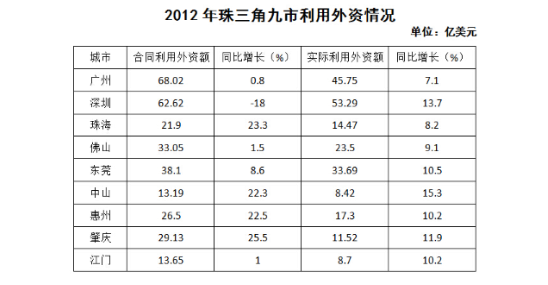 C、2012年珠三角九市實際利用外資總額同比增長速度超過10%