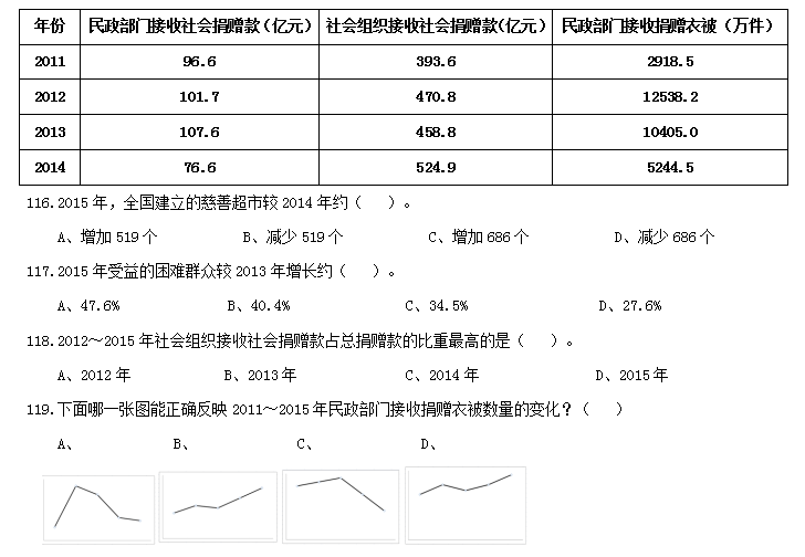 B、2015年民政部門接收捐贈(zèng)衣被同比增長率高于2014年的二分之一
