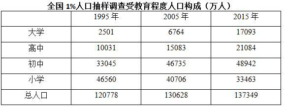 2005年全國1%人口抽樣調(diào)查主要數(shù)據(jù)公報顯示,同2000年第五次全國人口普查相比,2005年具有大學(xué)教育程度的人口增加2193萬人;具有高中教育程度的人口增加974萬人;具有初中教育程度的人口增加3746萬人,具有小學(xué)教育程度的人口減少4485萬人。